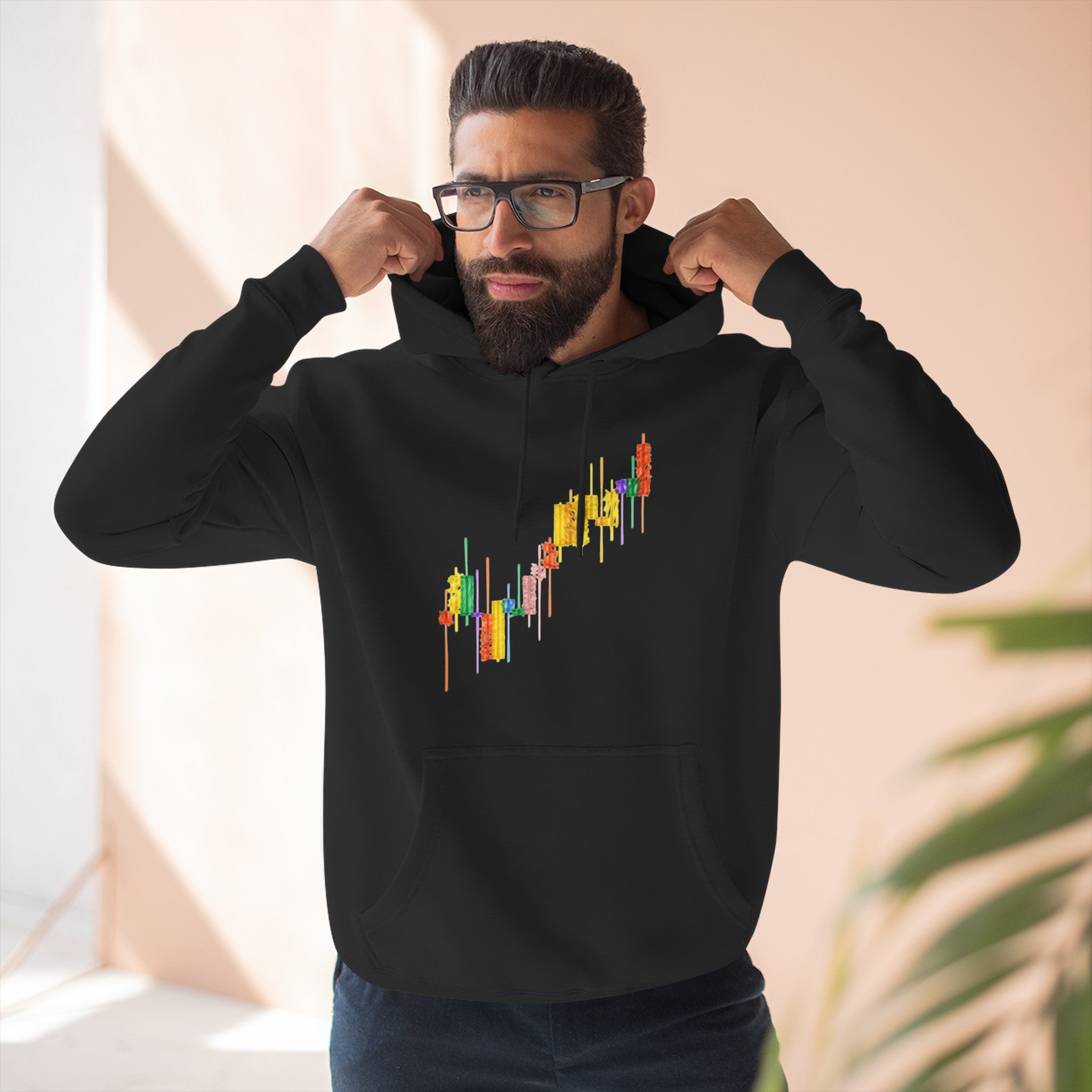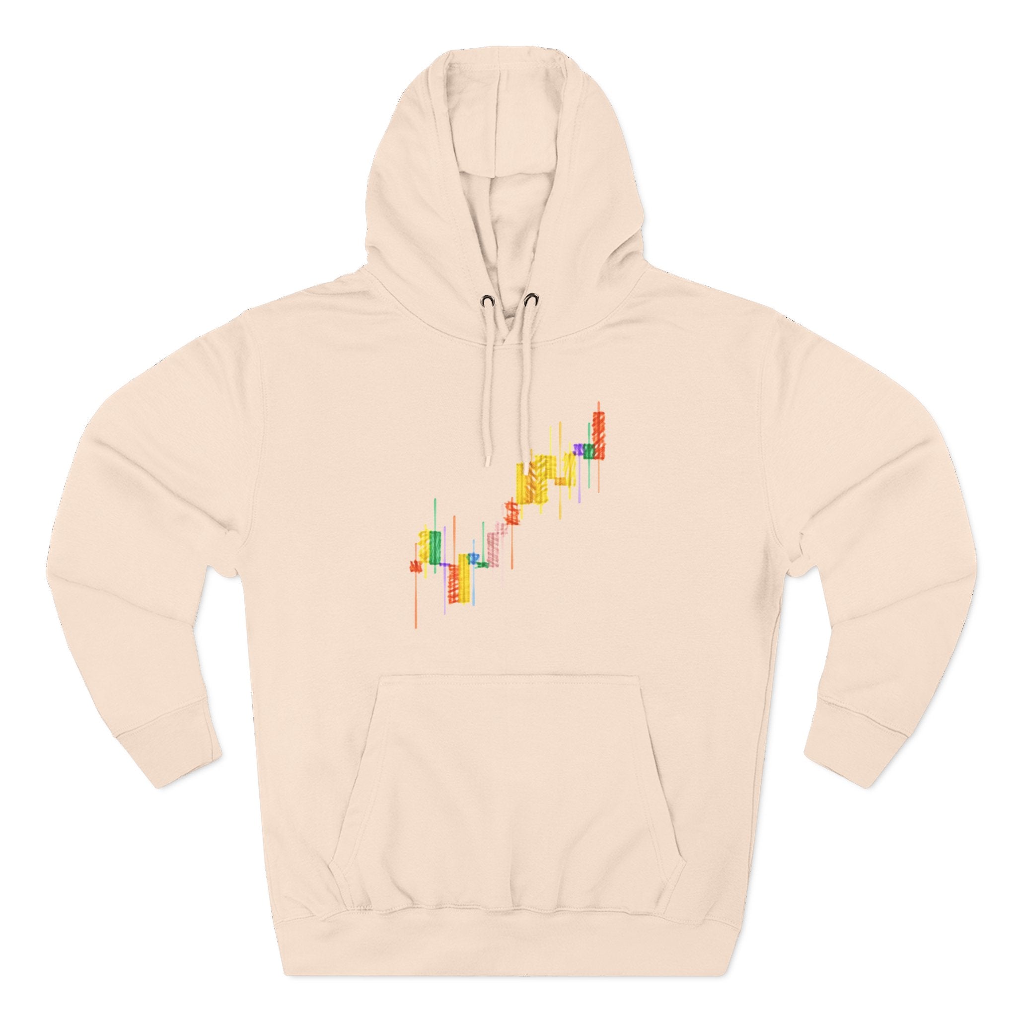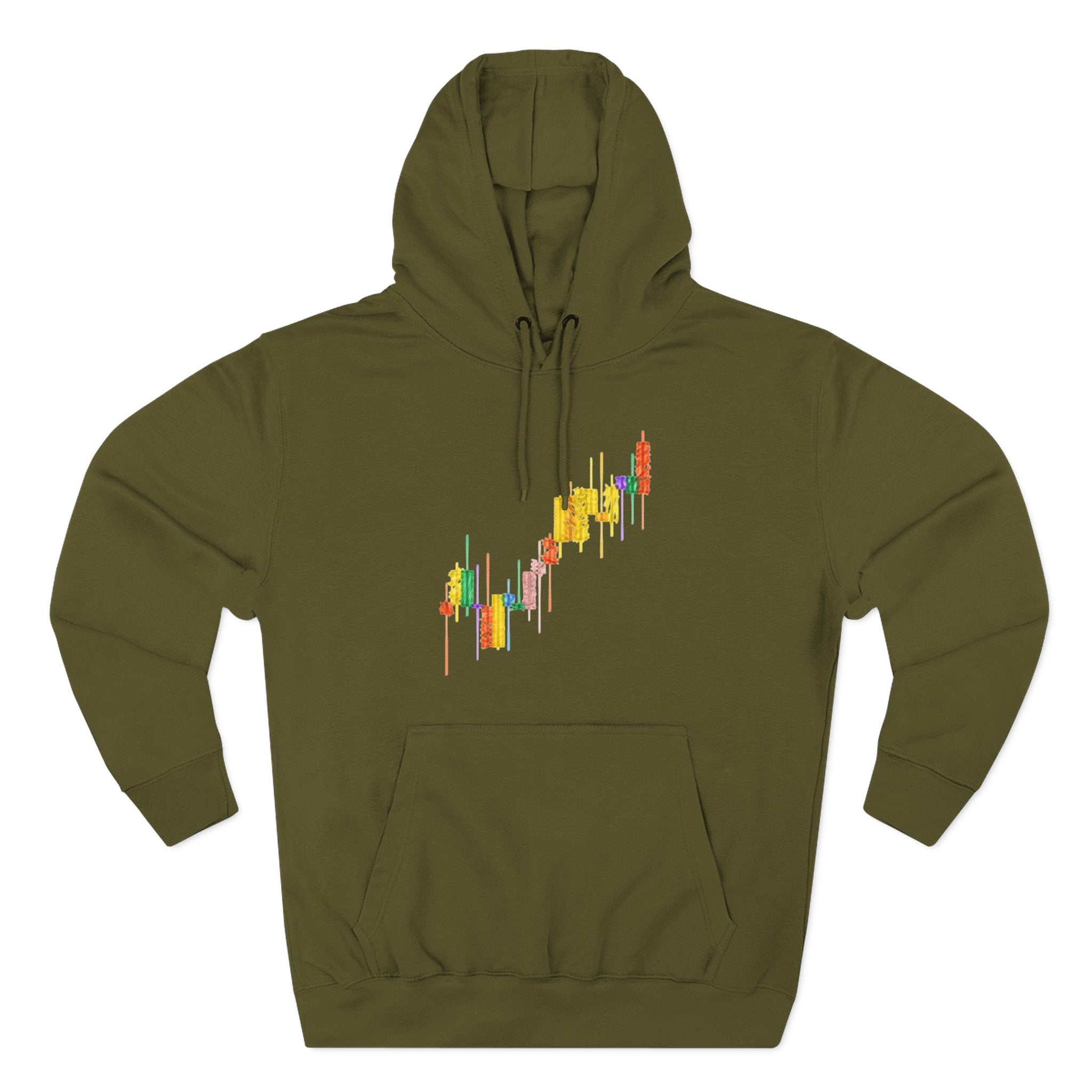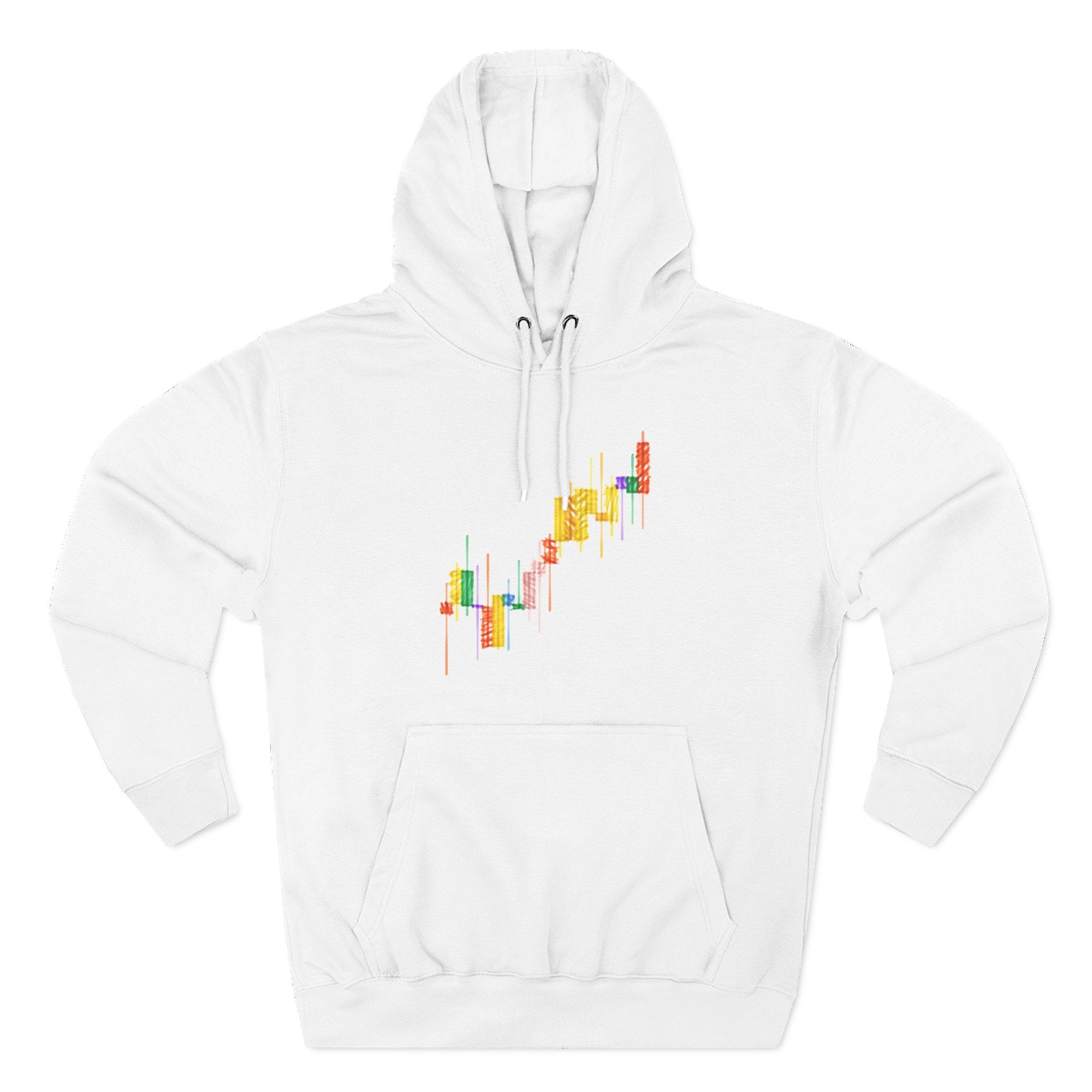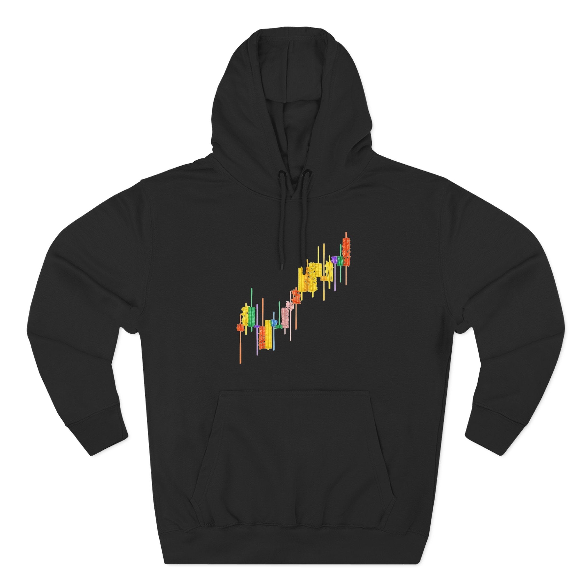 Three-Panel Fleece Hoodie — Colorful Candlestick Chart Graphic Unisex Streetwear Hoodie for Bullish Traders & Crypto Blockchain Fans