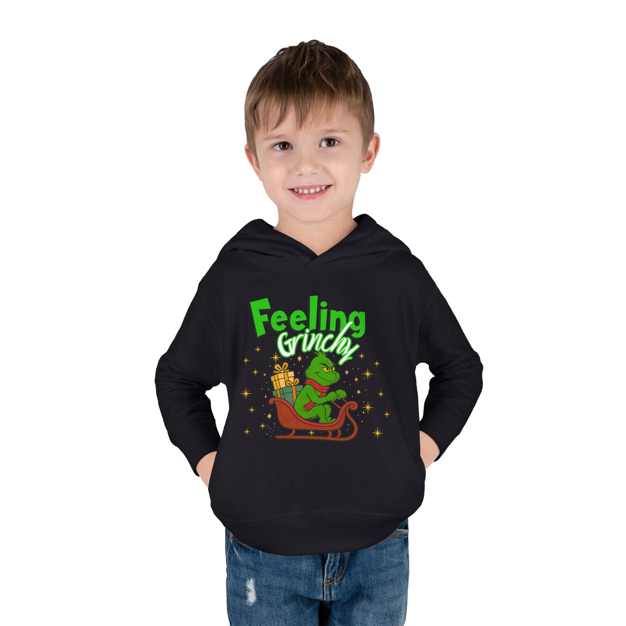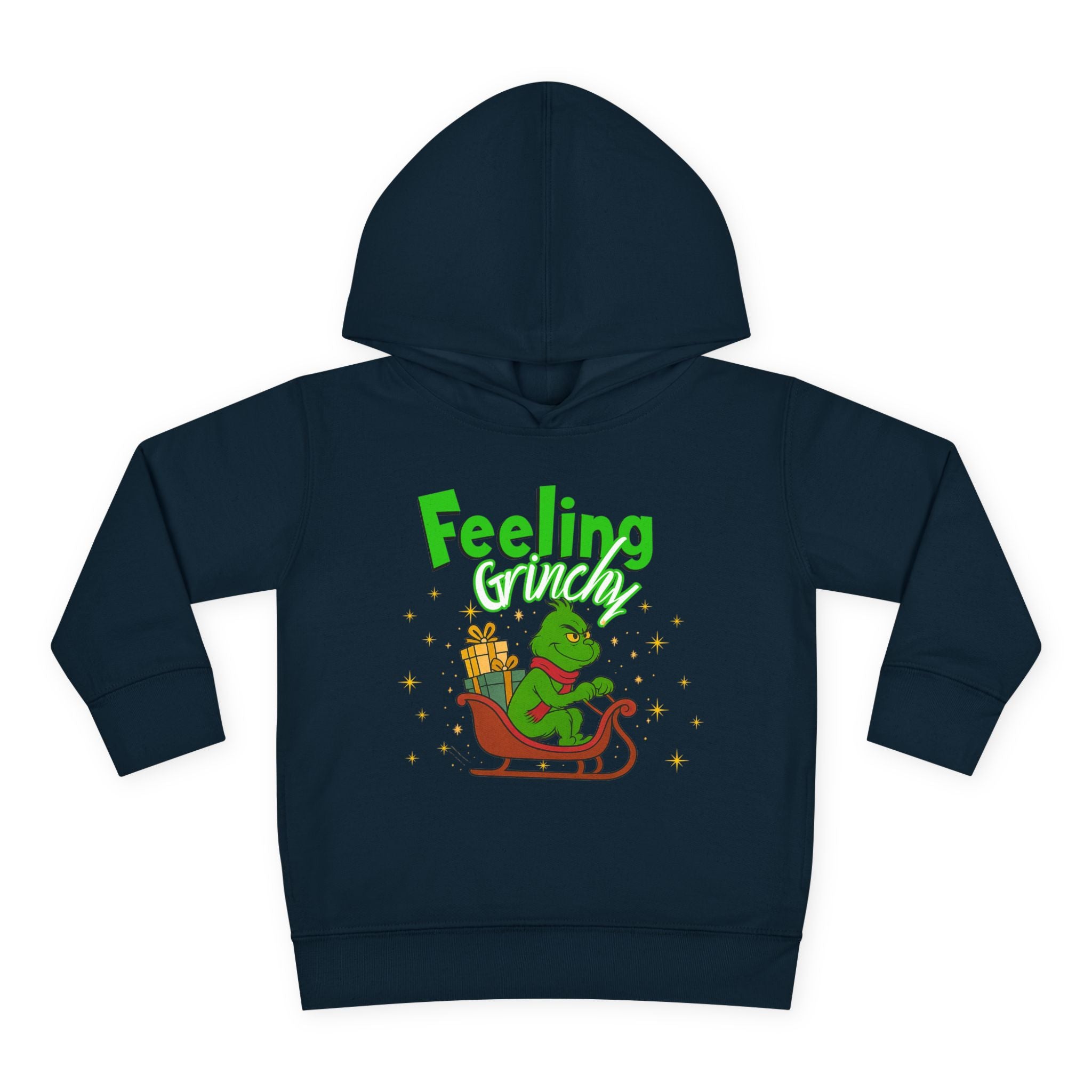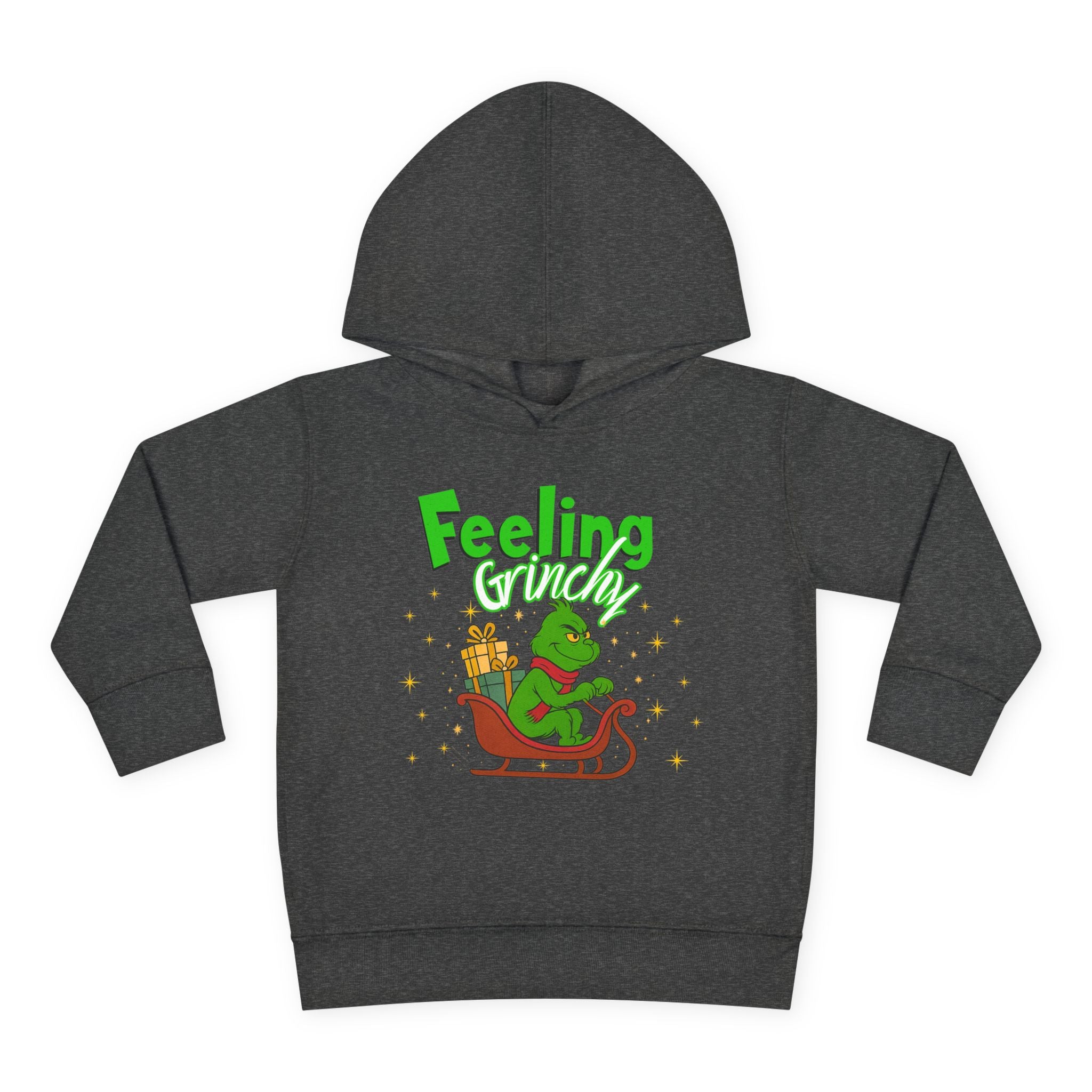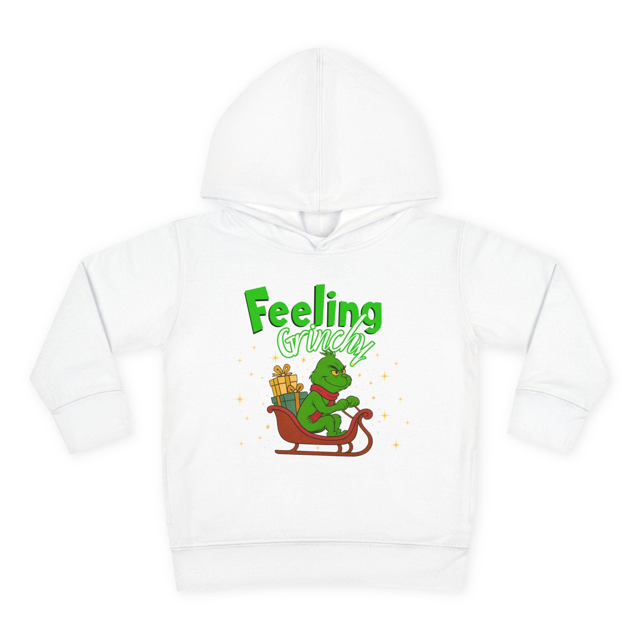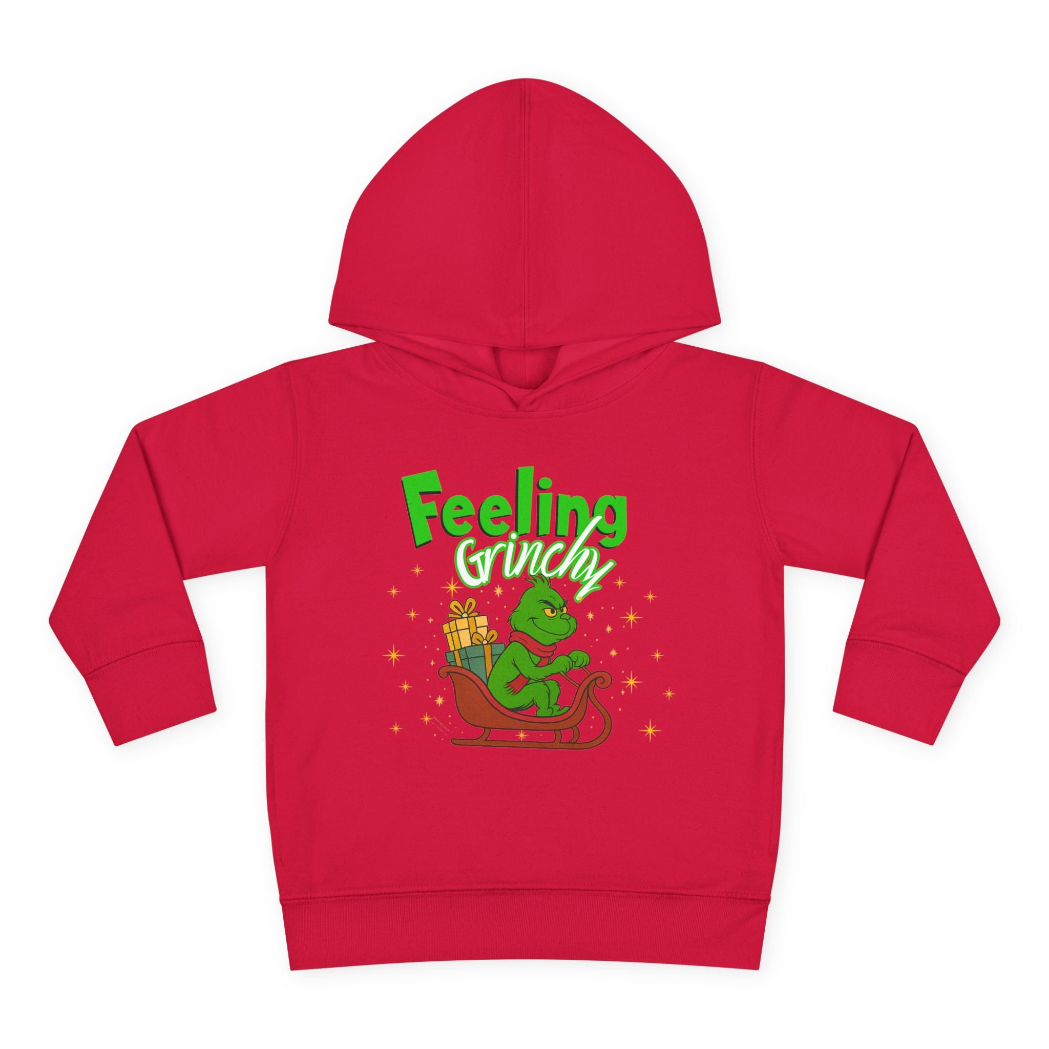 Soft, cozy, and just the right amount of cheeky — this toddler hoodie wraps little ones in warmth while channeling a playful holiday mood. The bright graphic shows a grumpy green character curled on a sleigh with a stack of gifts and the words “Feeling Grinchy,” giving the piece a mischievous, storybook charm. The medium-weight fleece feels gentle on sensitive skin, the hood and pockets add everyday practicality, and the clean white backdrop makes the illustration pop. It’s the kind of hoodie a child will reach for on chilly mornings, during holiday outings, or for cozy storytime on the couch — all while sparking smiles (and a little seasonal sass).