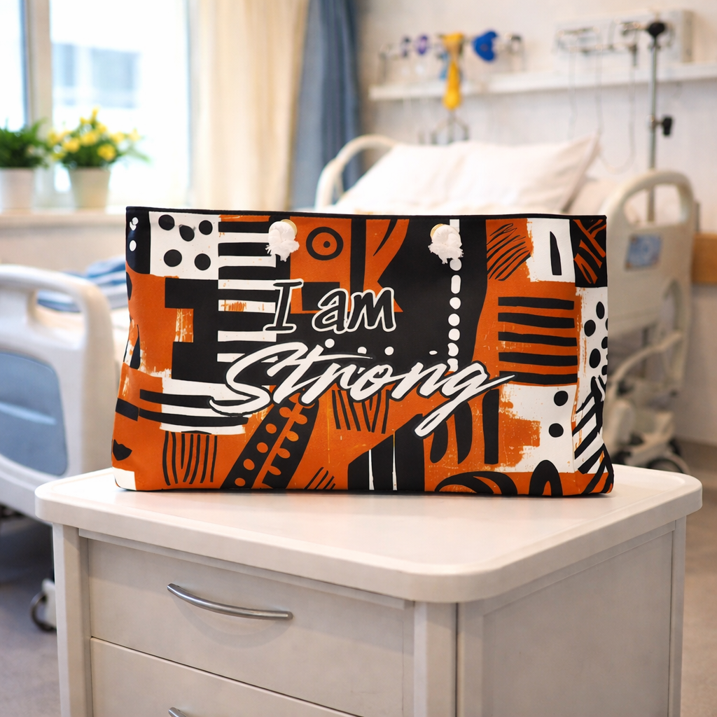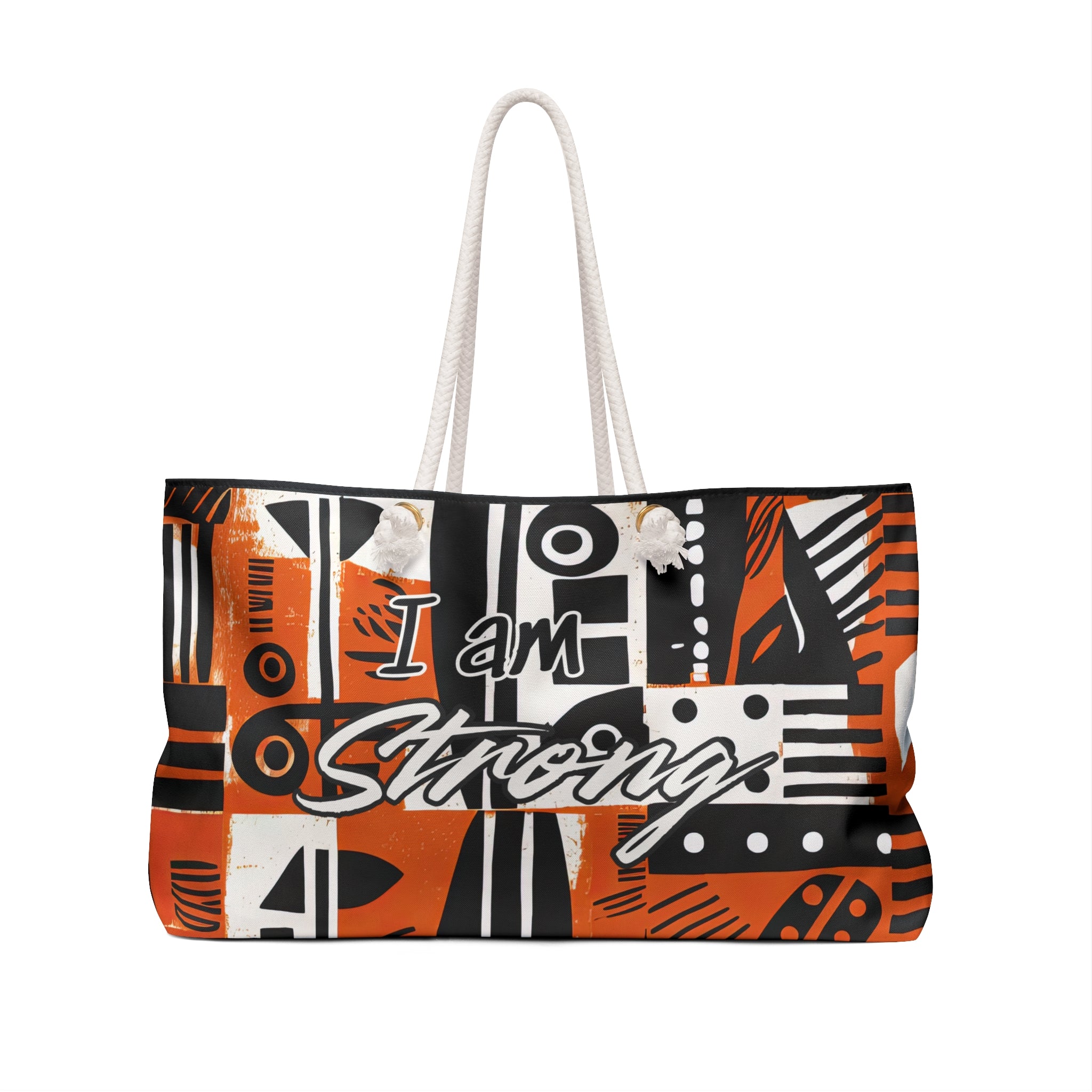 The bold orange, black, and white abstract print draws inspiration from contemporary African patterns, wrapped around sturdy premium fabric that keeps its form beautifully. Front and center, the affirmation I am Strong anchors the design with clarity, confidence, and emotional uplift.
