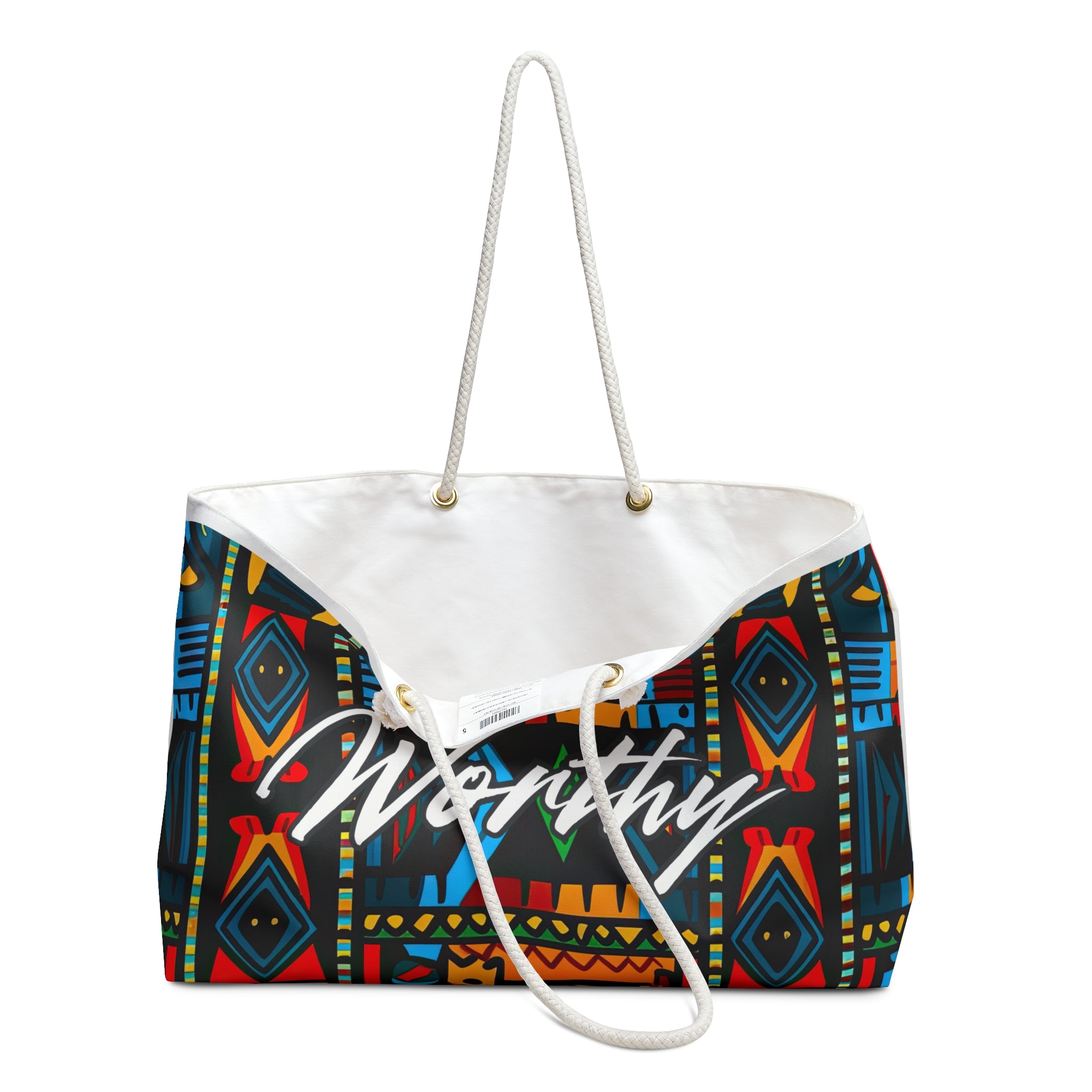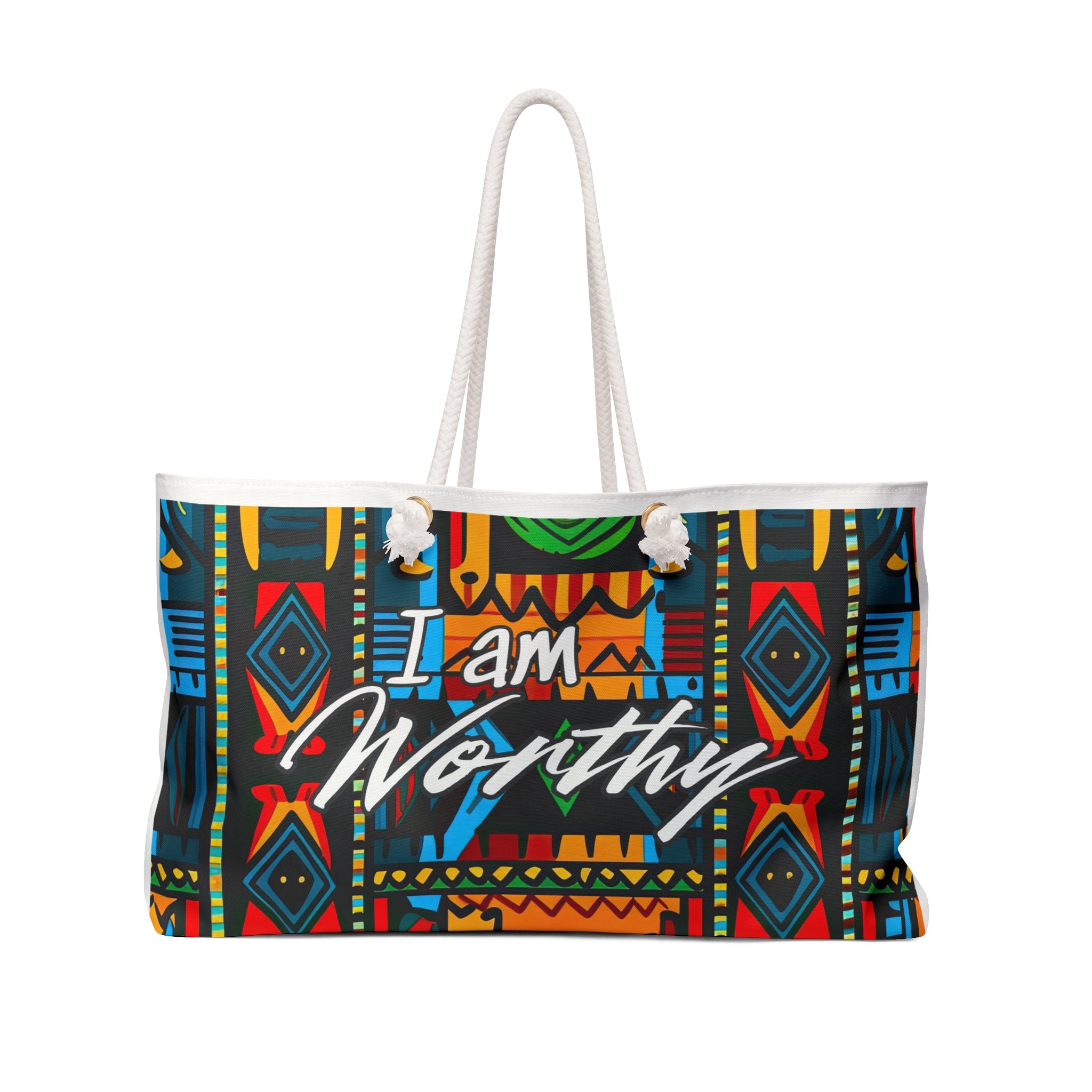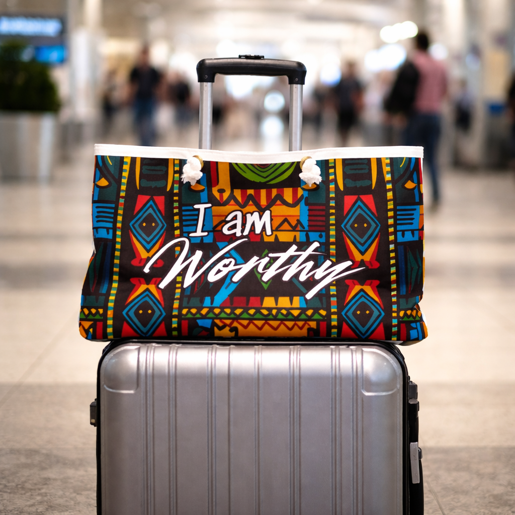 Designed in a generous 24 x 13 inch silhouette, this bag features a rich tapestry of geometric motifs, layered color, and cultural artistry that immediately commands attention. Centered on the design is the affirmation I am Worthy, a reminder of inherent value, confidence, and identity.