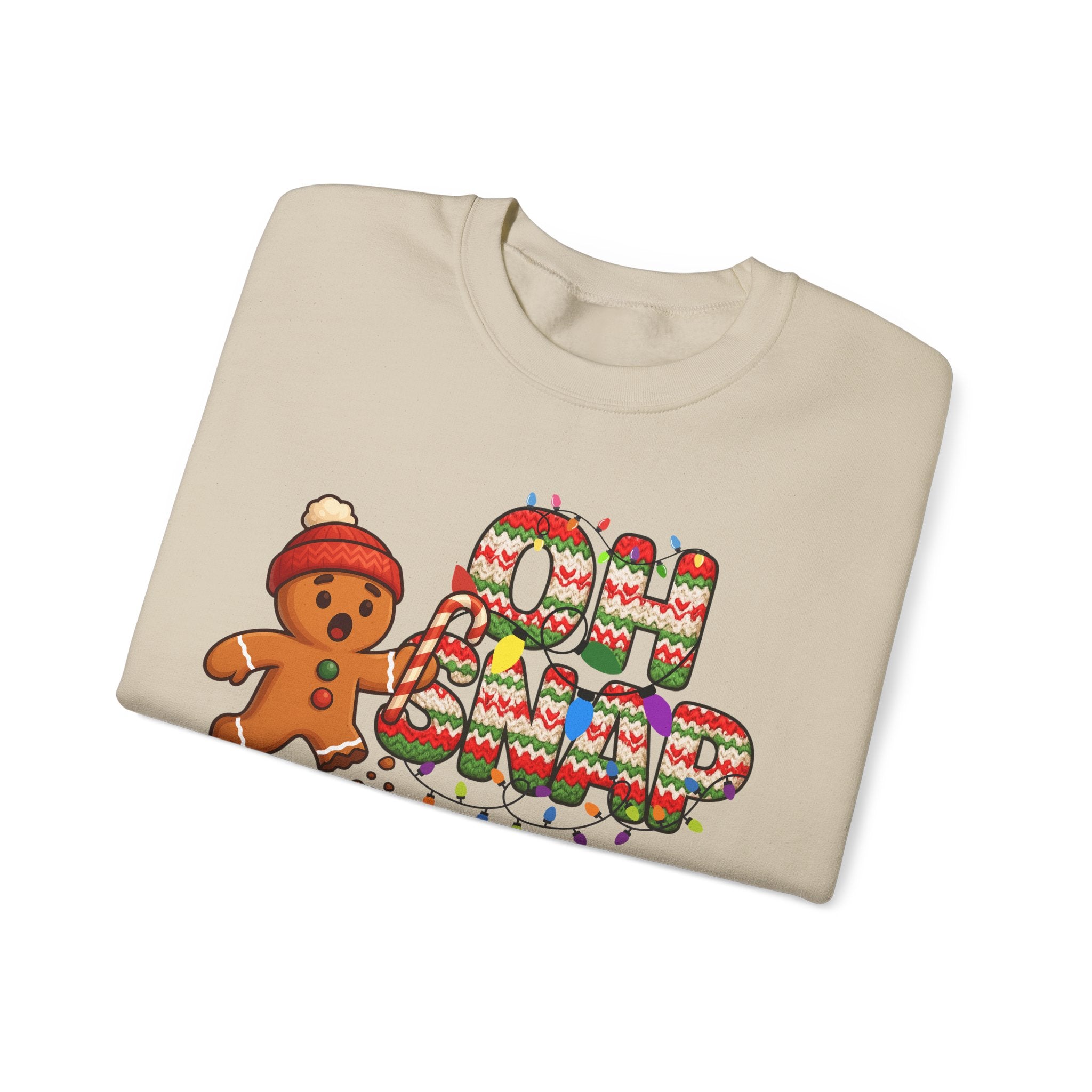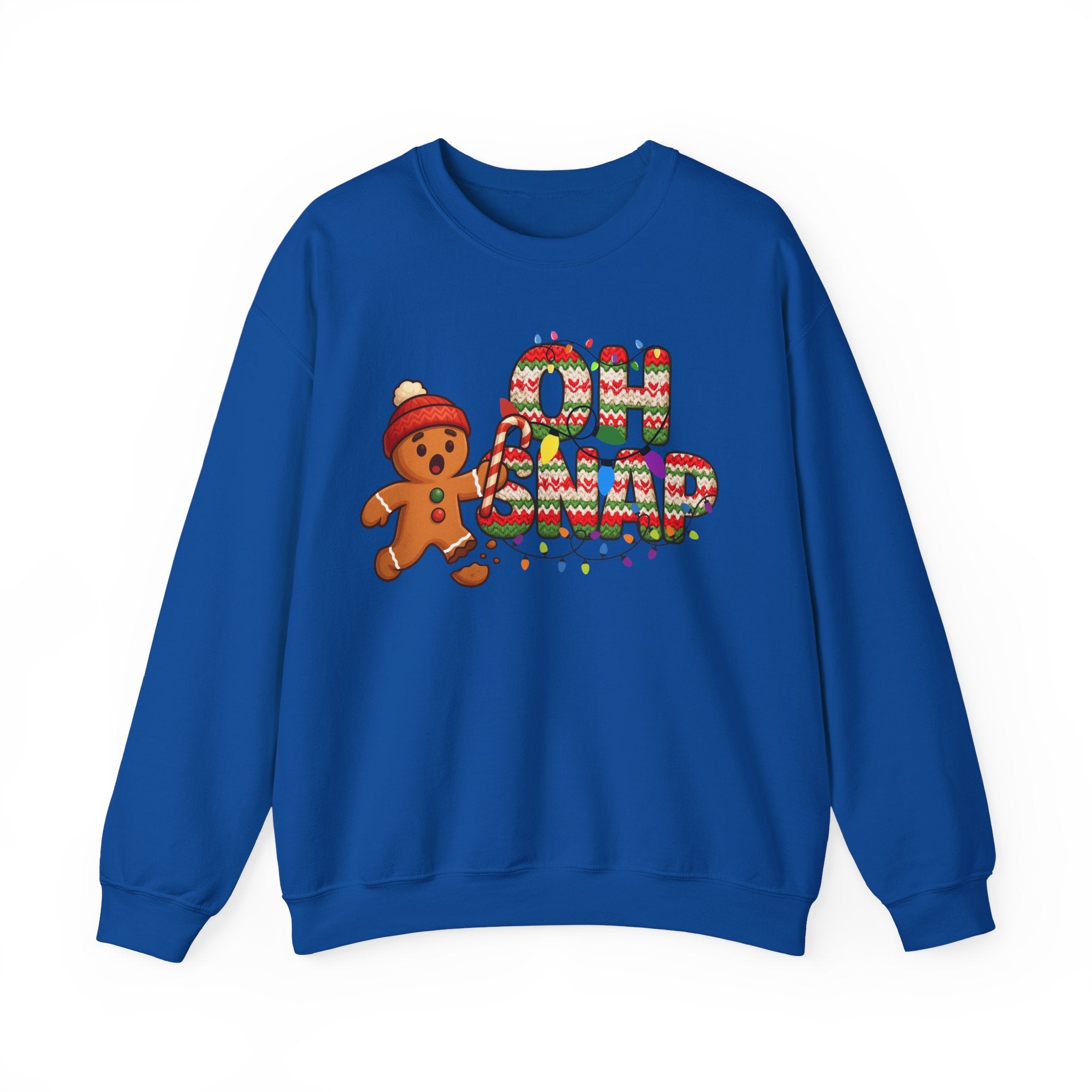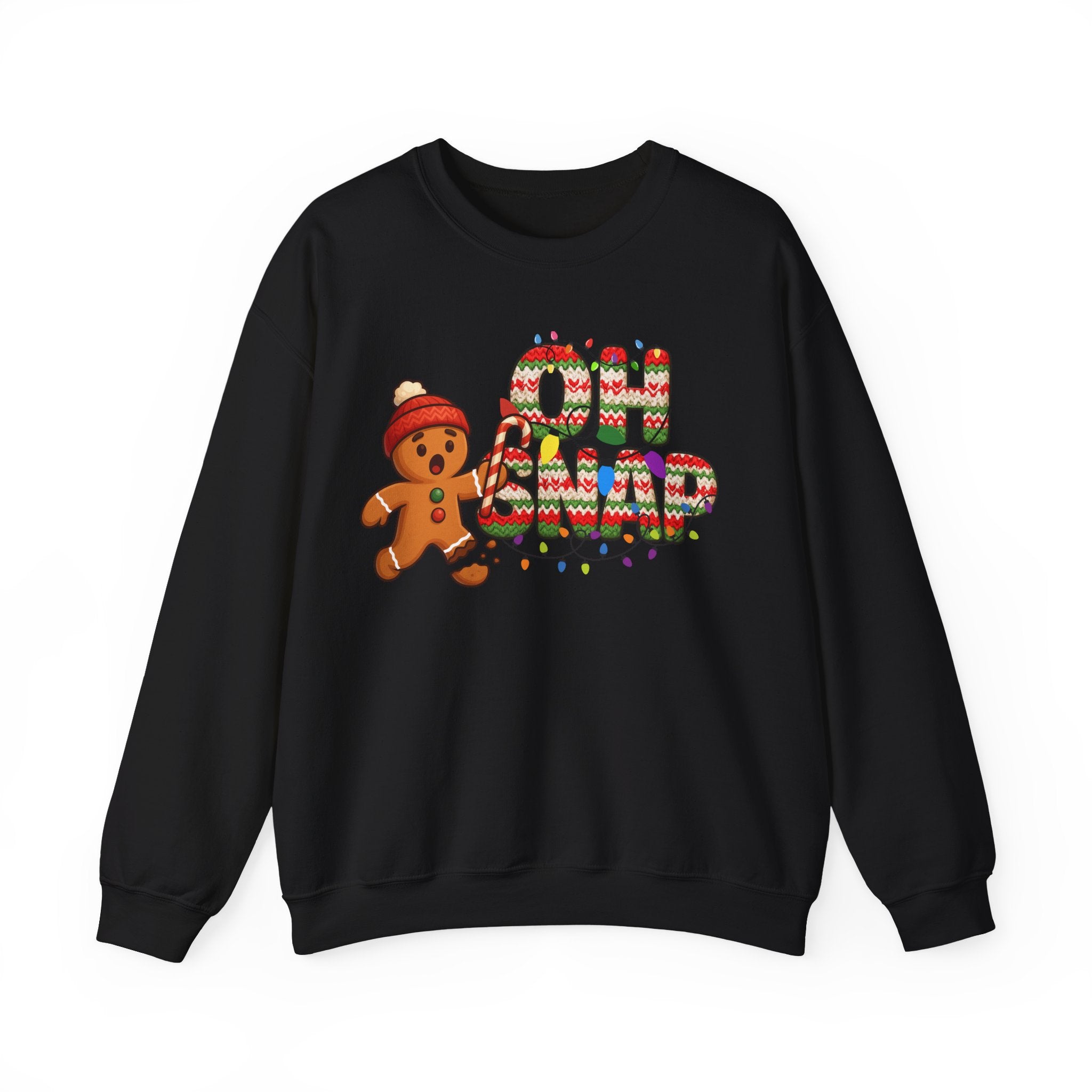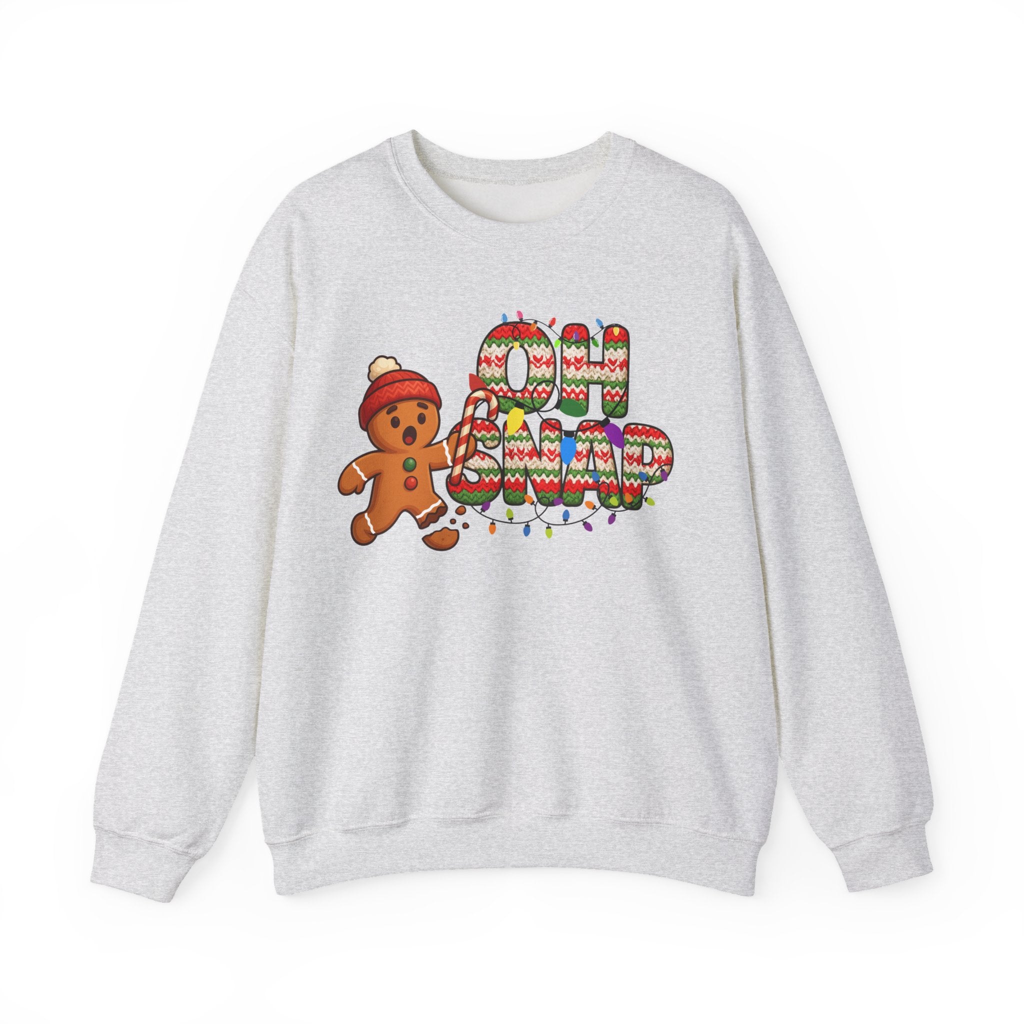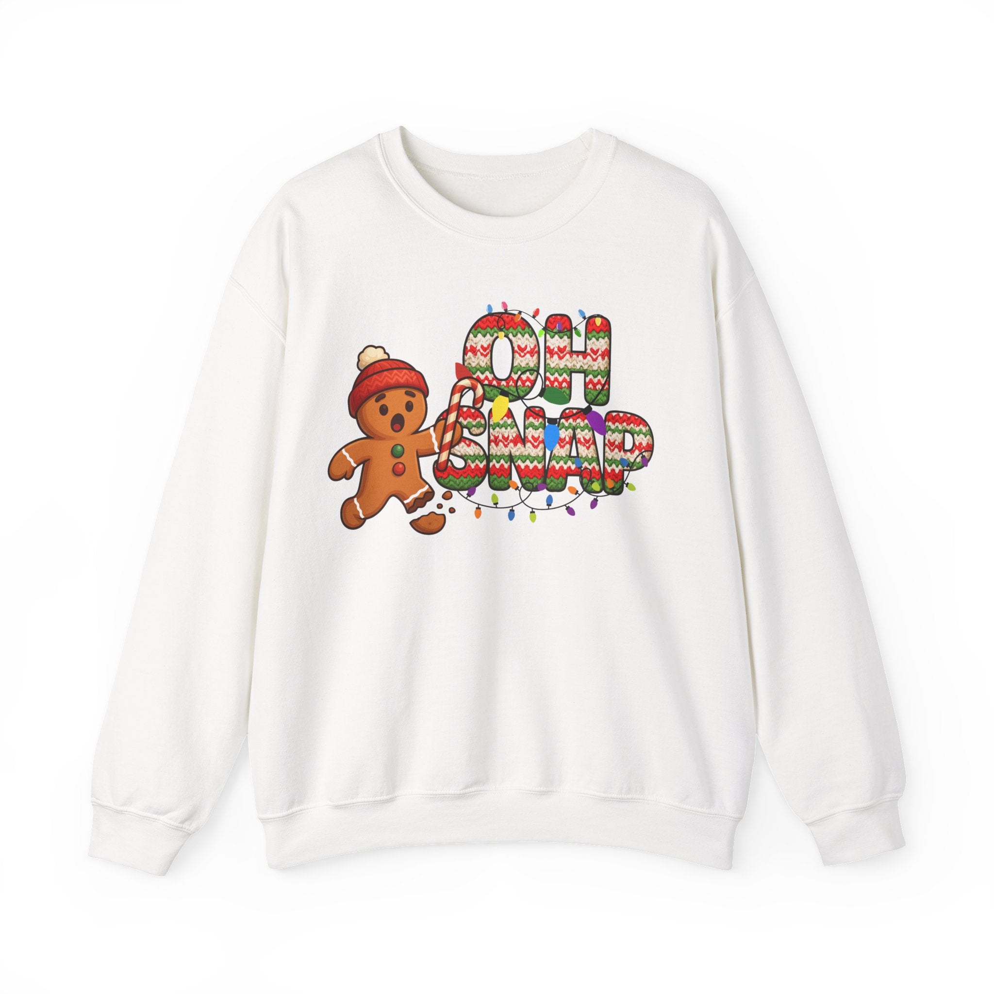 Serve holiday laughs with a side of cozy style in our Oh Snap Gingerbread Christmas Crewneck. This irresistible design features a shocked gingerbread cookie mid-crisis, clutching a candy cane while one little cookie foot has, well… snapped. Paired with bold knitted-texture lettering wrapped in colorful Christmas lights, this sweatshirt brings playful nostalgia and festive fun to every winter moment.