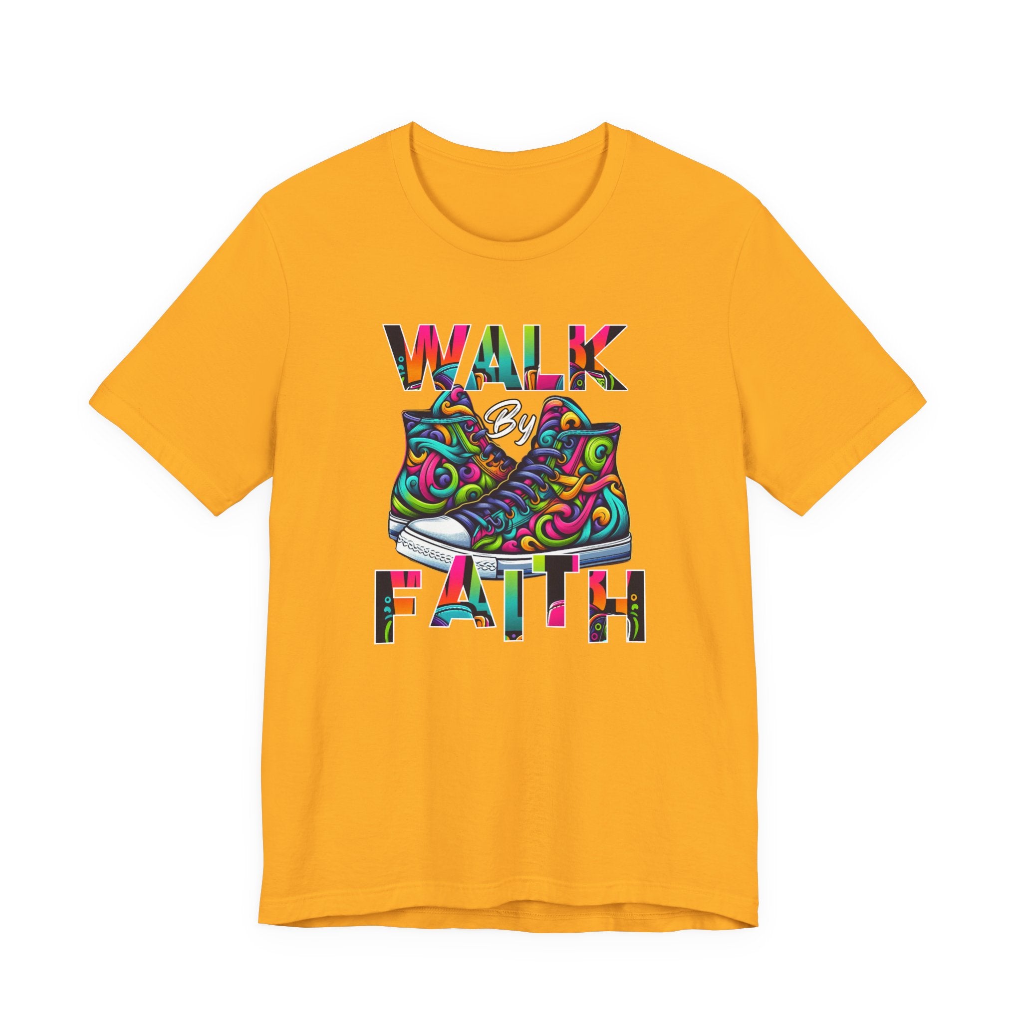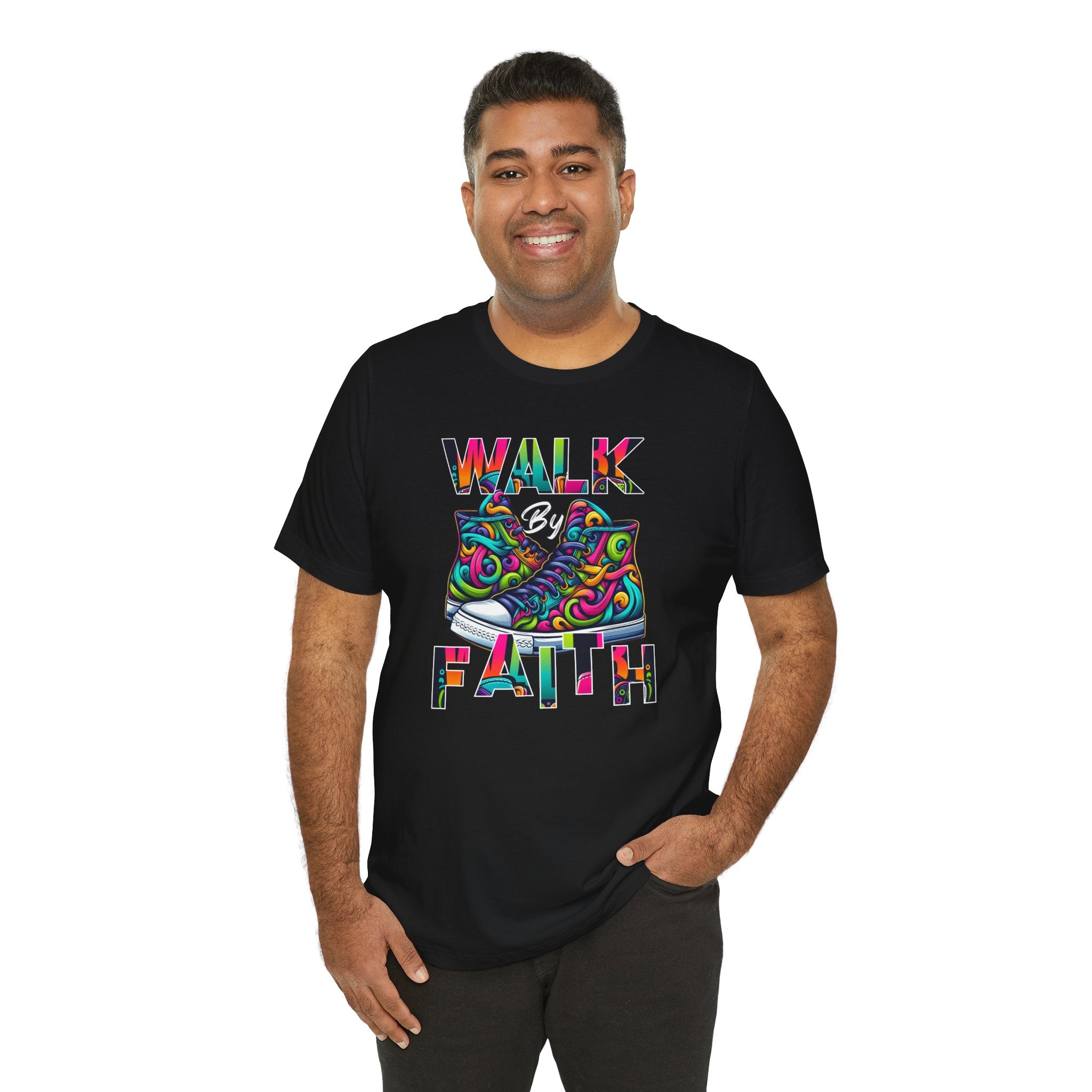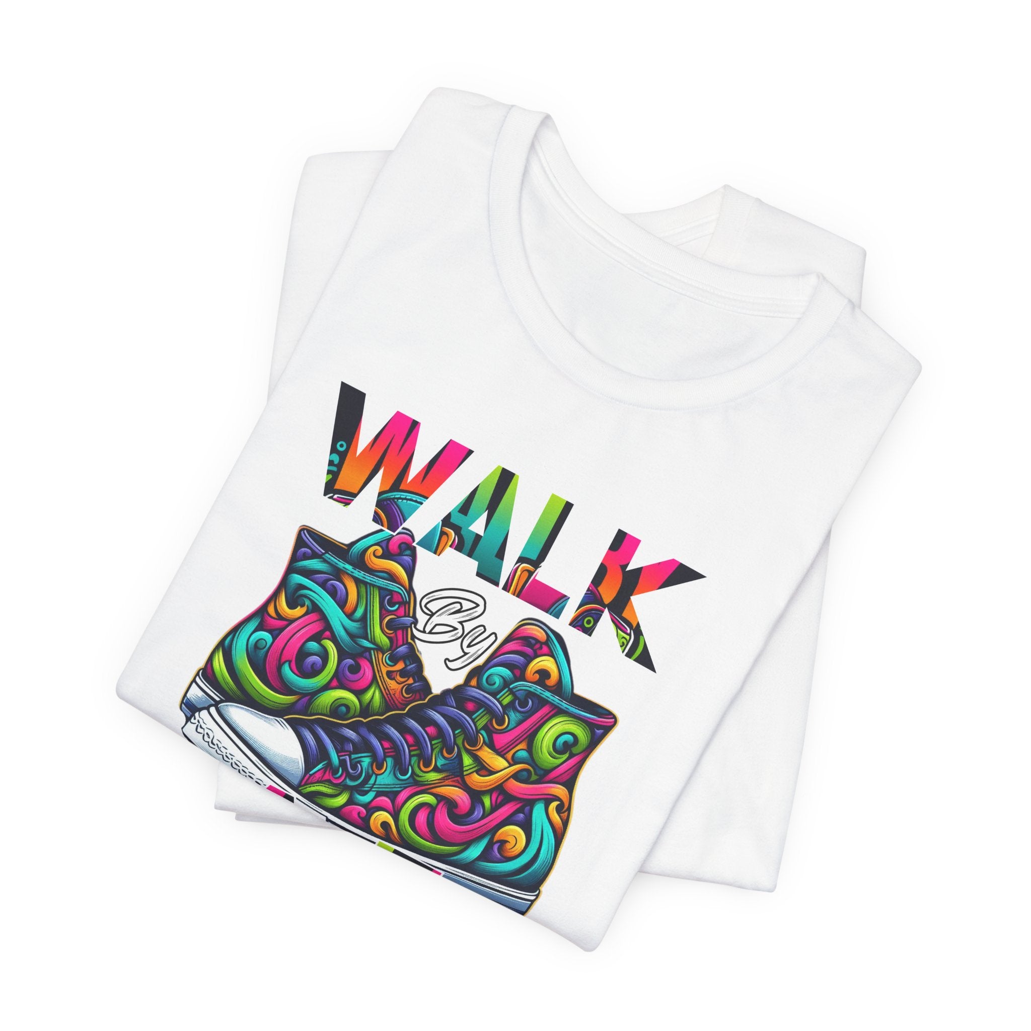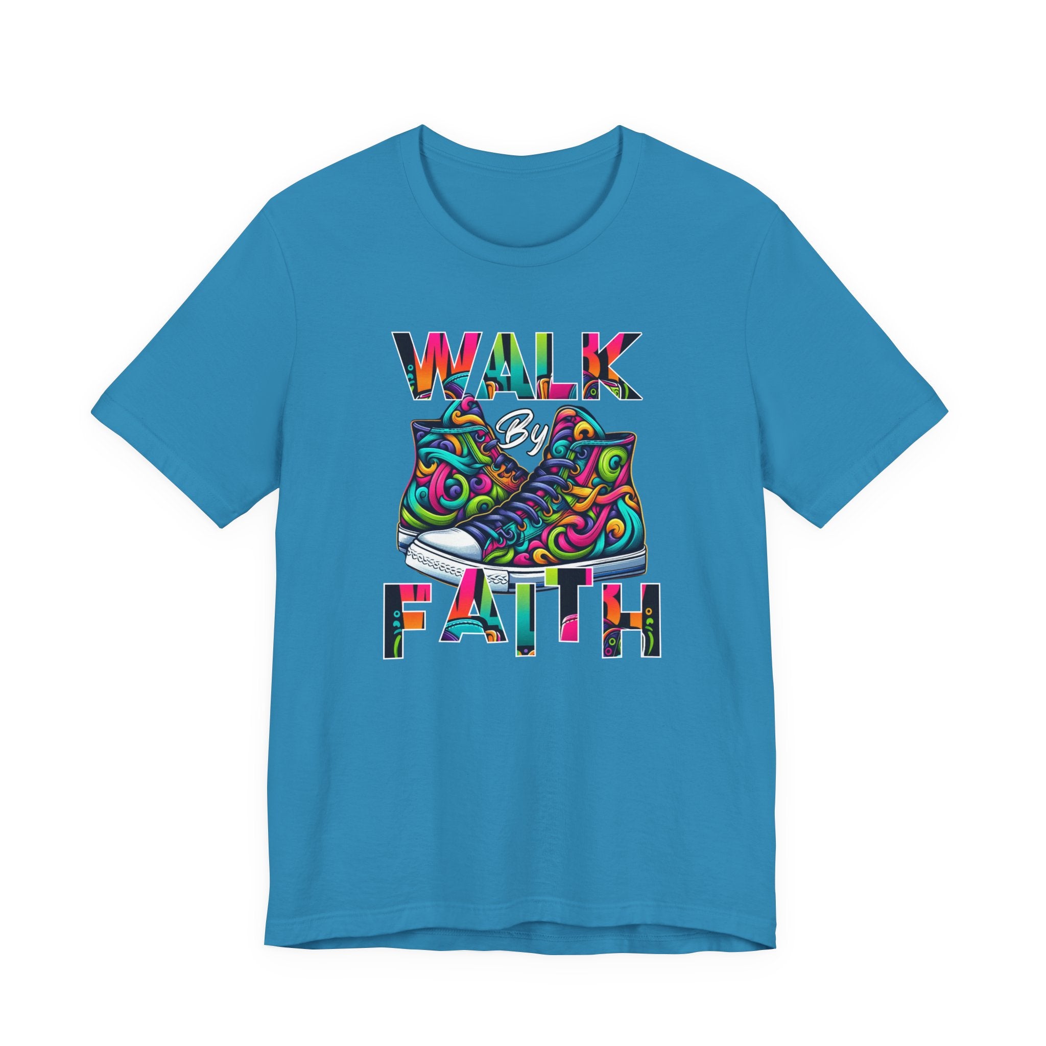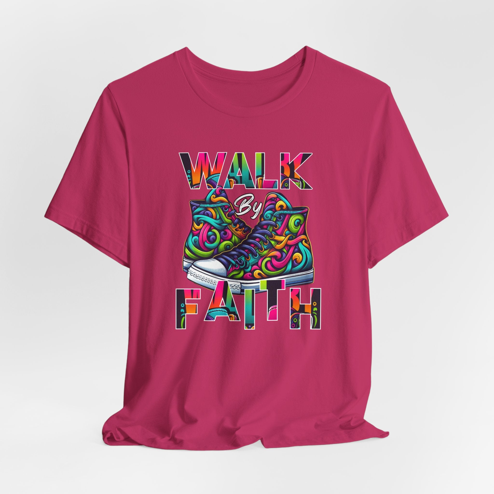 This lightweight cotton tee carries a bright, uplifting message: WALK by FAITH framed around a pair of vibrant, hand-drawn sneakers. The design blends bold color swirls and playful linework to create a joyful, modern faith-inspired statement that reads like wearable art. Breathable Airlume combed and ring-spun cotton keeps the shirt soft against skin and easy to layer. Subtle retail fit and a classic crew neckline make it simple to dress up with a jacket or keep casual with jeans. Ethical manufacturing and REACH certification mean you’re choosing quality crafted with care. Wear it on days when you need a reminder to move forward with confidence — the artwork does the talking with color and heart.